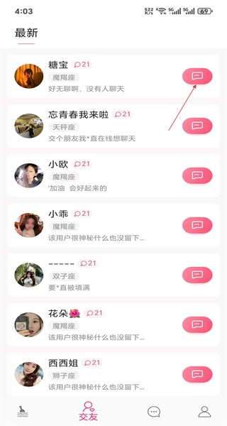 1、打开软件后,进入最新列表页,看到糖宝等用户的动态,点击糖宝对应的聊天按钮进入对话页面。