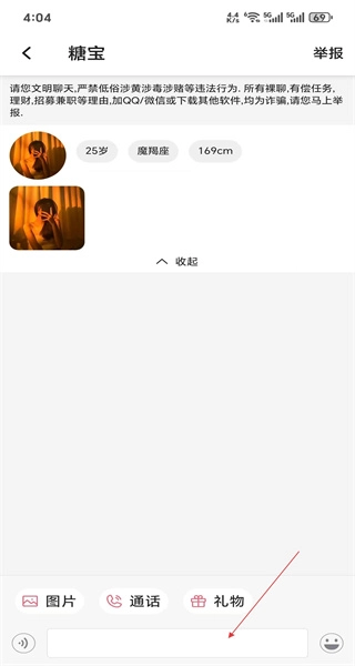 2、进入与糖宝的聊天页,看到对方的资料信息,底部有图片、通话等功能按钮,激活输入框准备交流。