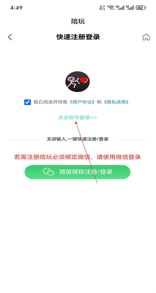 2、进入快速注册登录页,勾选协议后点击账号登录选项,切换到用户登录的信息填写页面。