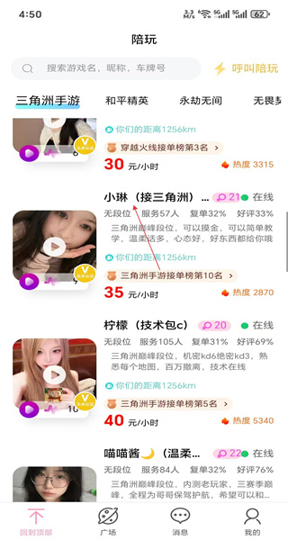 4、登录成功后回到首页,切换到三角洲分类,查看该分类下的陪玩人员信息,选择目标陪玩。