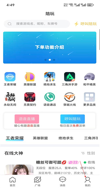 1、打开软件后,进入首页,看到各类游戏选项及在线大神列表,点击我的进入登录页面。