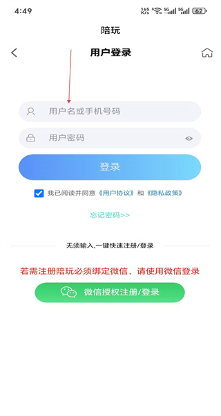 3、在用户登录页,输入用户名或手机号码、用户密码,确认协议后可点击登录按钮完成操作。