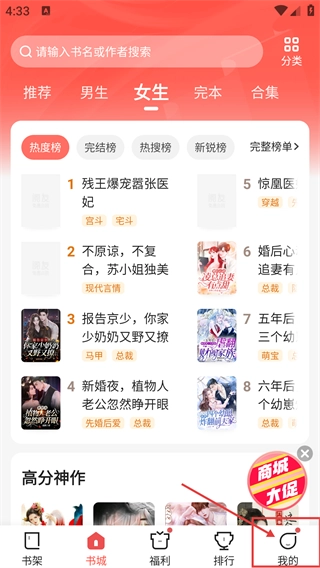 1、在书城的女生频道页面,点击底部的【我的】按钮,就能进入个人中心页面。