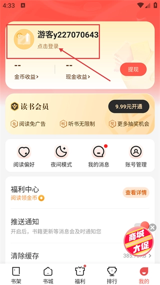 2、进入“我的”页面后,点击【点击登录】区域,该页面包含金币收益、读书会员等功能选项。