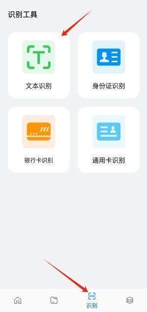 3、当我们点击下方的“识别”选项时,会发现这里有多种丰富的识别工具可供使用,像文本识别、通用卡识别等。