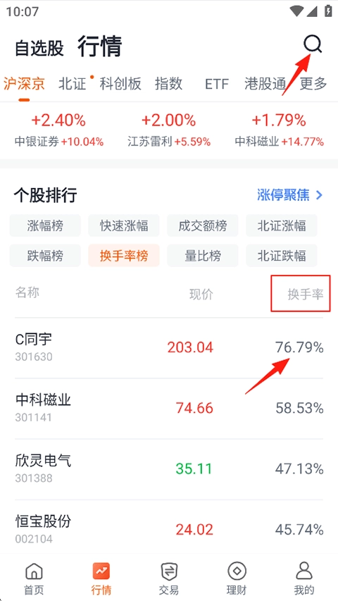 1、打开汇通启富,进入行情功能页面,可通过个股排行中的换手率选项查看,也能点击右上角的搜索按钮进行查找;