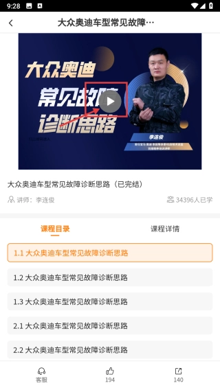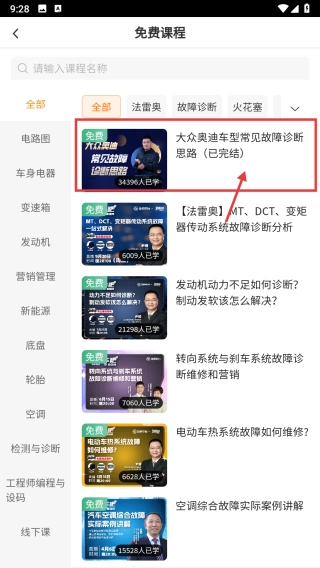 3、在免费课程列表中,找到大众奥迪车型常见故障诊断思路这一课程条目并点击,即可进入该课程的详情页面。