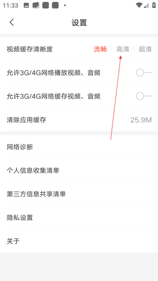 4、在设置界面,调整【视频缓存清晰度】功能参数,即可完成设置缓存清晰度操作。