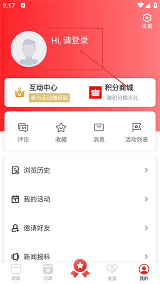 2、进入【我的】页面后,找到【Hi,请登录】区域,点击可进入登录流程,同时能看到【互动中心】【积分商城】等功能入口。