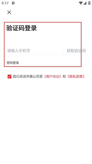 3、进入登录流程后,呈现【验证码登录】界面,可填写【请输入手机号】并点击【获取验证码】。