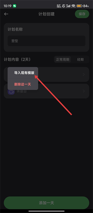 2、在计划创建页面,我们先输入计划名称如【塑型】,再点击【添加一天】,逐步搭建计划内容哦。