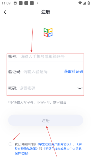 4、在注册界面【输入信息,勾选协议】后点【注册】即可完成账号注册操作。