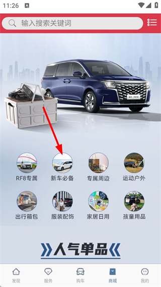 2、在商城页面,点击新车必备分类,进入对应商品列表页面。