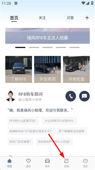 1、在江淮瑞风首页,点击底部商城选项,进入商城页面。