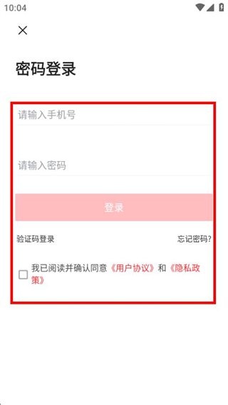 4、在密码登录页面,输入信息并勾选协议后,点击登录即可完成登录。