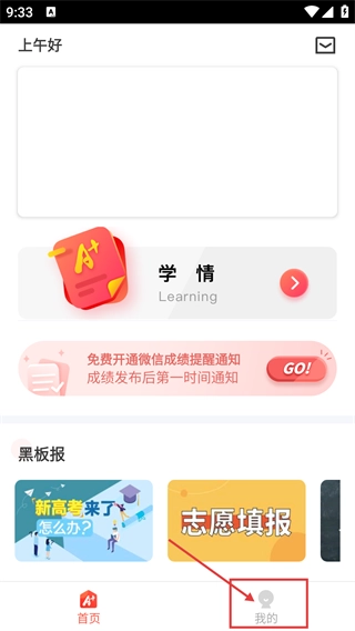 进入软件首页后,你可以看到【学情-Learning】之类的功能选项,也能开启微信成绩提醒服务,之后点击底部导航栏的【我的】就能进入个人中心页面。