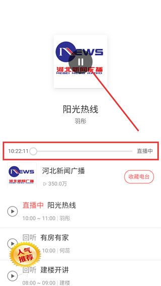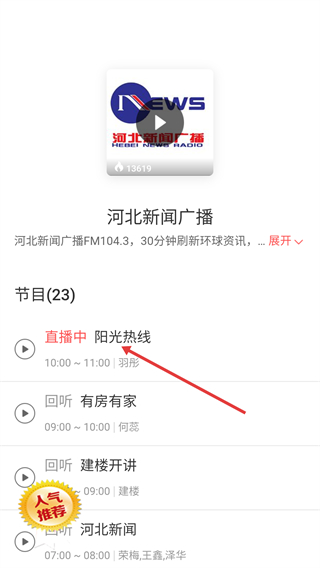 3、在电台节目列表页,点击【直播中】的节目(如【阳光热线】),即可进入该节目的播放界面,同时支持回听往期节目。