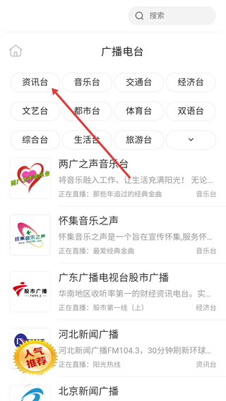 1、在广播电台页面,点击【资讯台】分类标签,可筛选出资讯类电台,页面同时支持音乐台、交通台等其他分类切换。
