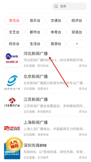 2、进入资讯台分类后,选择目标电台(如【河北新闻广播】),点击电台条目可进入该电台的节目列表页面。