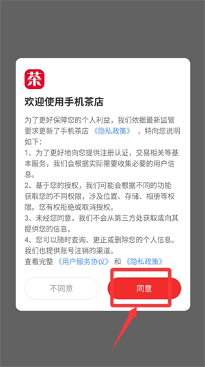 1、打开手机上的茶店应用,仔细阅读隐私政策及其他相关内容,确认无误后点击同意。