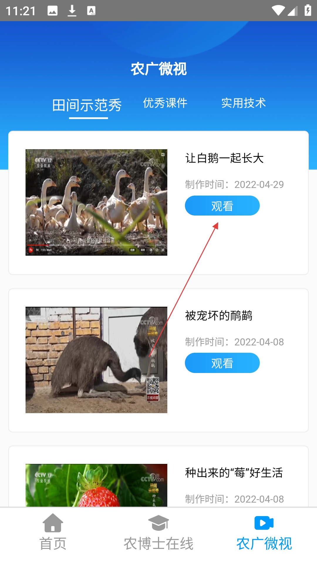 2、在农广微视专区点击目标视频的【观看】按钮进入播放页。