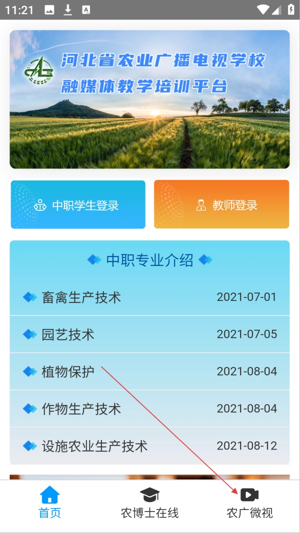 1、打开冀农云学堂,点击底部【农广微视】进入视频专区。