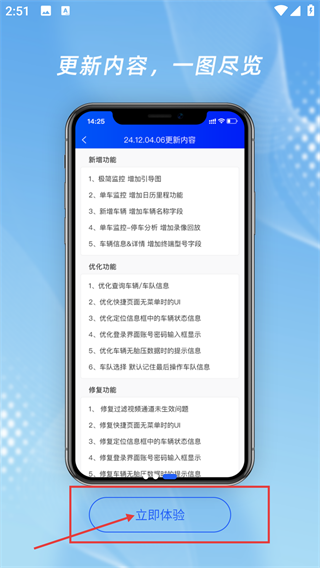 1、查看【更新内容-一图尽览】中的功能优化要点,确认无误后点击【立即体验】按钮,进入应用即可开始使用相关监控功能。