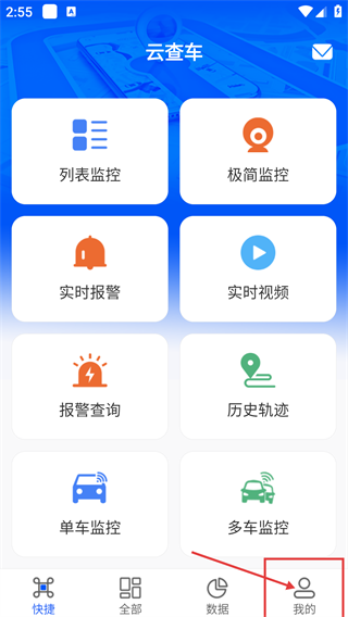 进入【云查车】首页后,能使用【列表监控】-【极简监控】等功能,通过底部的【我的】入口可进入个人中心。