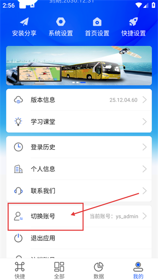 3、进入【我的】页面后,找到【切换账号】选项。当前登录的账号是【ysadmin】,点击该选项即可更换登录的账号。