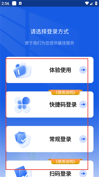 4、进入登录方式选择页面后,可在【体验使用】、【快捷码登录】、【常规登录】等方式中进行选择,选定后完成登录操作。