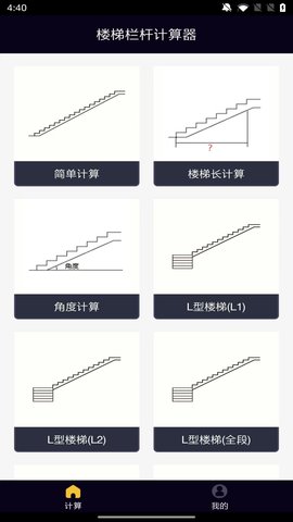 楼梯栏杆计算器是一款非常实用的楼梯计算器工具软件,它能够帮助用户解决与楼梯和栏杆相关的各种计算问题,无论是简单的楼梯计算还是更复杂的角度计算、L型楼梯计算、二阶楼梯计算、二折楼梯计算、三折楼梯计算、盘梯计算,甚至是直栏杆计算和斜栏杆计算,这款应用都能够轻松应对。