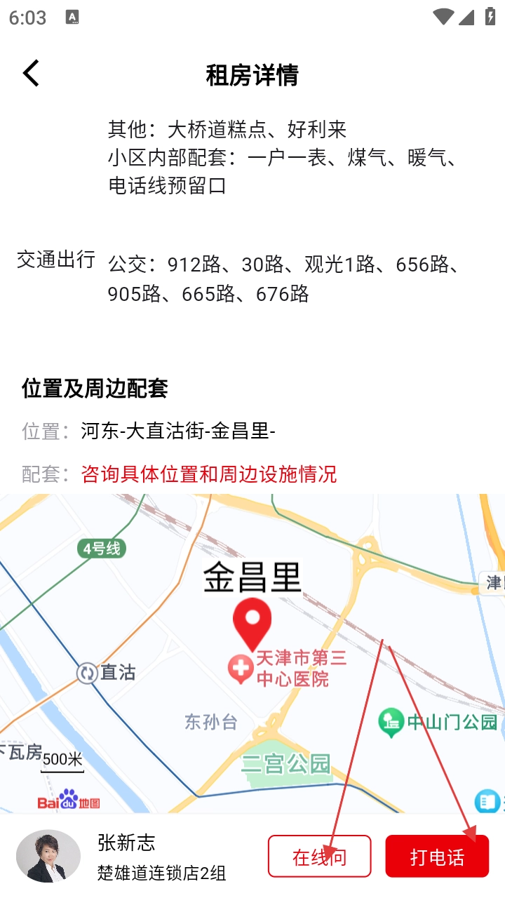 4、若有咨询需求,可点击【在线问】或【打电话】,联系经纪人以了解房源的更多详细信息。