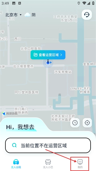1、进入【无人出租】页面,可点击【查看运营区域】了解服务范围,底部点击【我的】进入个人中心。