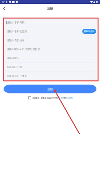 3、在注册页,依次填写手机号、验证码、姓名、密码等信息,选择小区与用户类型,勾选协议后点击【注册】完成账号创建。