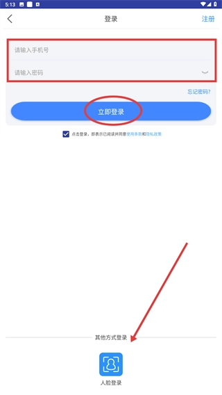 2、在登录页,填写【请输入手机号】与【请输入密码】,勾选协议后点击【立即登录】,也可选择【人脸登录】完成验证。