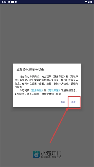 1、在【服务协议和隐私政策】弹窗,点击【同意】按钮,确认条款后进入【小猫开门】应用的后续流程。