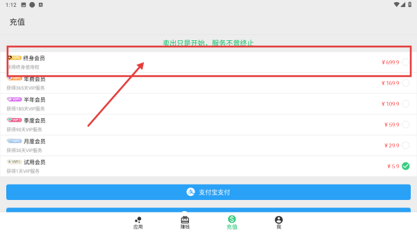 2、进入充值界面,挑选如终身会员之类的套餐,点击相应选项,利用支付宝完成支付以开通服务。