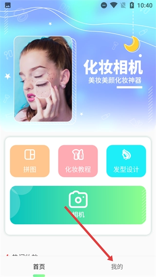 1、在【化妆相机】首页点击底部的【我的】按钮,该首页设有【拼图】【化妆教程】【发型设计】等美妆类功能选项。