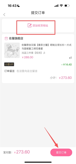 在提交订单的页面上,添加好收货地址后,点击提交订单按钮即可完成整个下单流程。