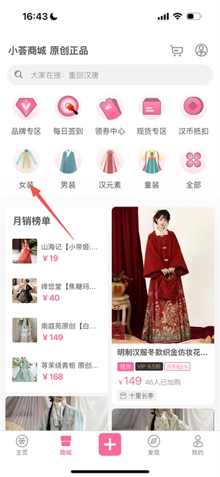 在小荟商城页面,点击女装分类,进入女装商品列表页。