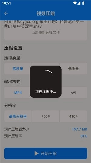 4、调整压缩质量、输出格式和分辨率,随后点击“开始压缩”按钮就可以了。