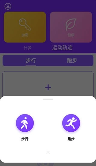 5、还可以在上方切换到“运动轨迹”,然后点击右侧的“+”号,选择想要进行的运动类型,步行还是跑步。