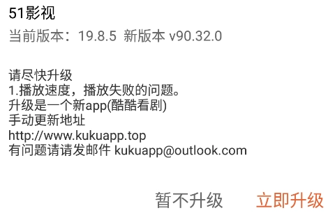 打开51影视后,会弹出一个窗口,点击右下角的立即升级按钮。