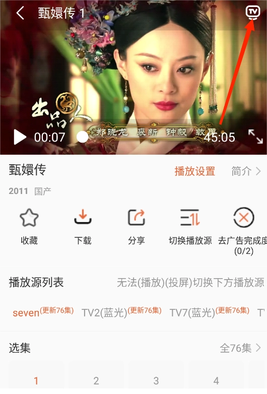 还是拿《甄嬛传》来举例,用户按照前面提到的投屏步骤进入视频播放页面后,点击图中所示的按钮。