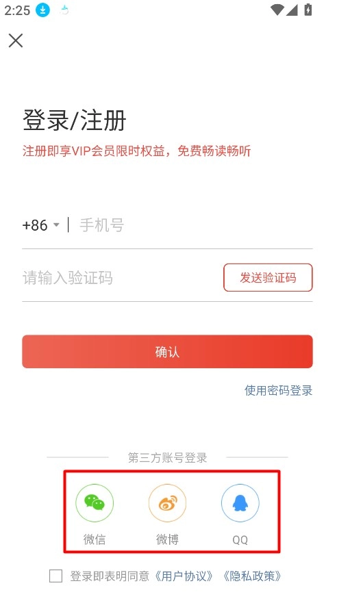 3、输入手机号与收到的验证码即可完成快速登录,也可选择微信、微博或QQ三种方式进行第三方授权登录。