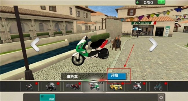 首先我们启动游戏,初次进入游戏时,系统会直接提供一辆小摩托供我们使用,接着我们点击开始按钮即可。