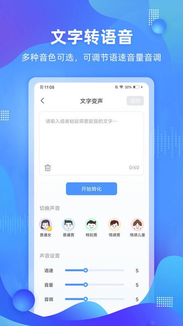 - 音文互转: 语音可实时转换成文字,也支持仅输入文字就能生成录音