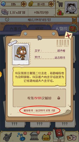 历史长河里的伟人才是真正值得我们追寻的星光。在这个页面中,那些在历史上留下深刻印记的伟人,都化作了形态万千的猫咪形象,以一种新颖的方式被记录在游戏里。想要解锁这些猫咪,需要先研发出对应时代的特定科技,然后按照每个图鉴猫下方标注的条件去收集就可以了。此外,当集齐一定数量的图鉴猫时,还会有隐藏的“彩蛋”等待着各位喵星发展官去探索发现呢。