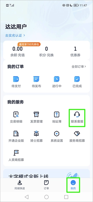 打开已启动的应用,在“我的”页面里找到并点击“联系客服”这一选项。