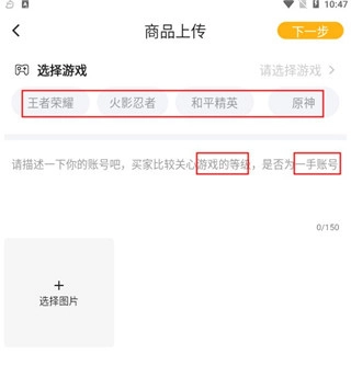 进入页面后,上传游戏账号的基本信息(如游戏名称、游戏等级等),再上传相关图片,之后点击“下一步”按钮等待审核就可以了。